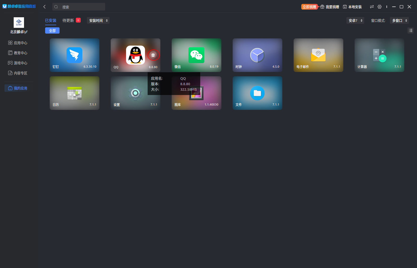点击麟卓卓懿应用商城主界面中“我的应用”功能图标,在“我的应用”界面中,选中一个安卓应用,此时会自动浮现一个卸载按钮。单击卸载按钮,卸载此应用,如下图:
