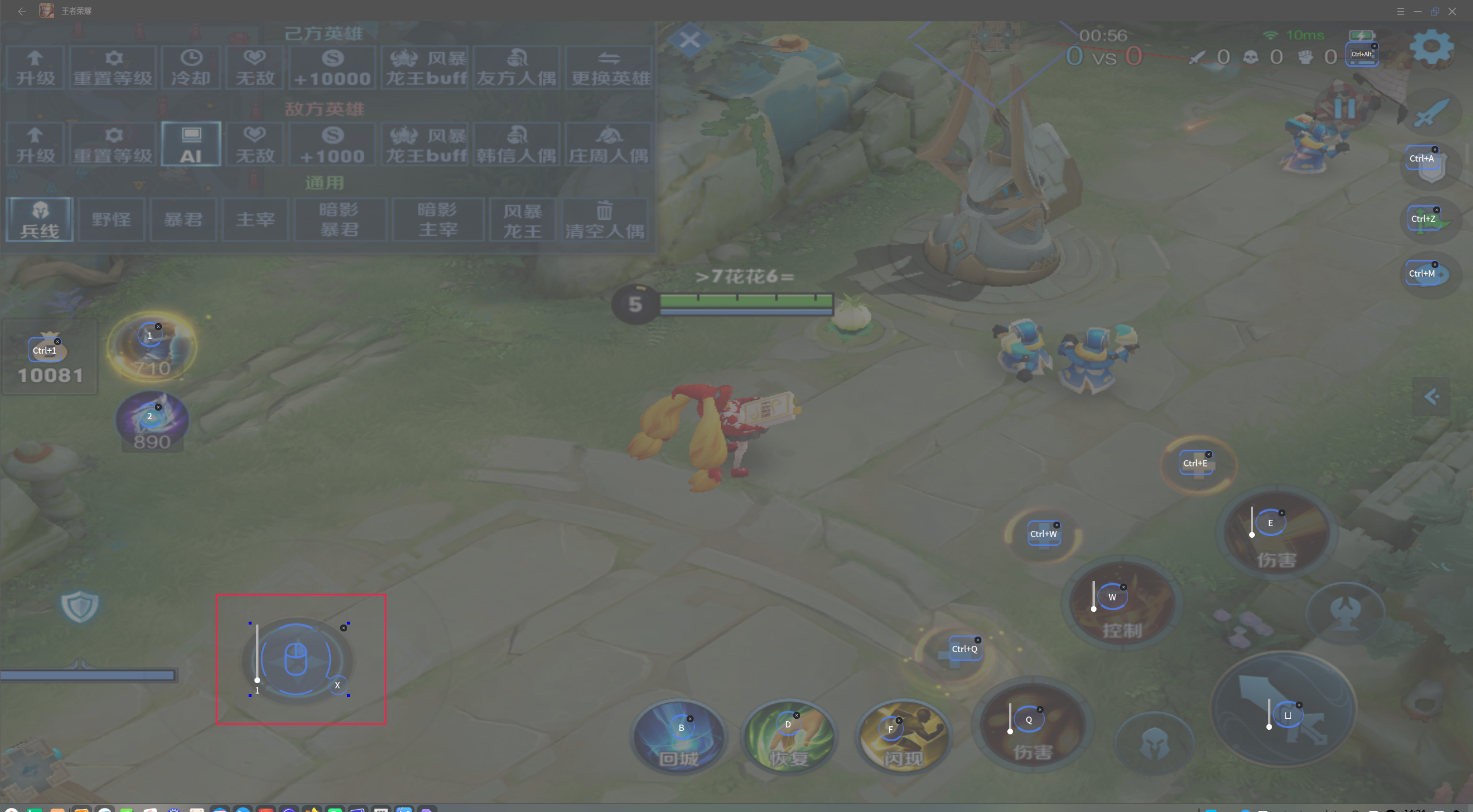 3.实现键盘按键按动一次,模拟器内相对应按键按动一次,以王者为例,我们将点击键放置在亚瑟1技能加点的位置上,在功能键内填入了键盘1键。启动映射后,按键盘上的1键会加点1技能。